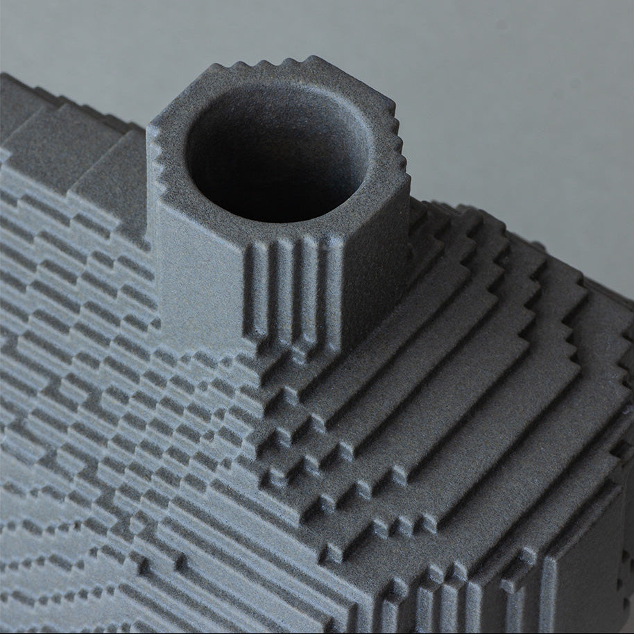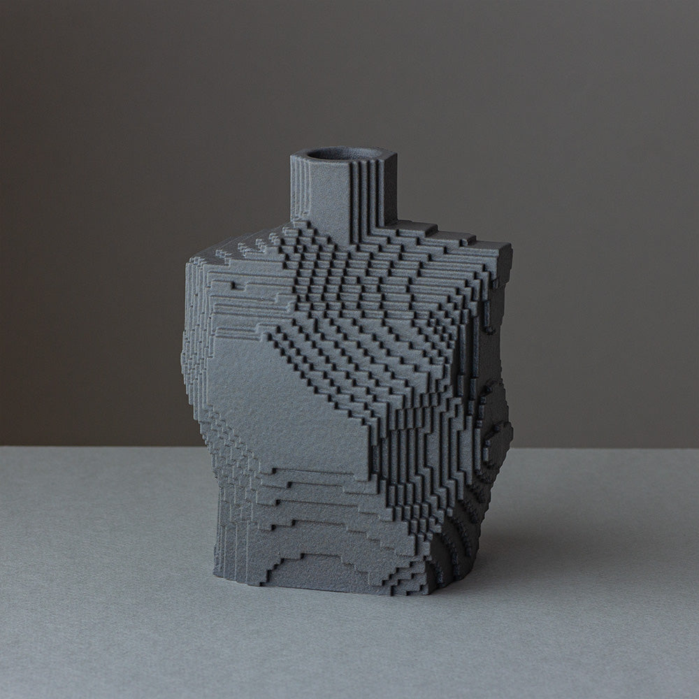 Generated through programming, the voxel structure creates a surreal impression—as if an object from the digital world has stepped directly into the physical one.